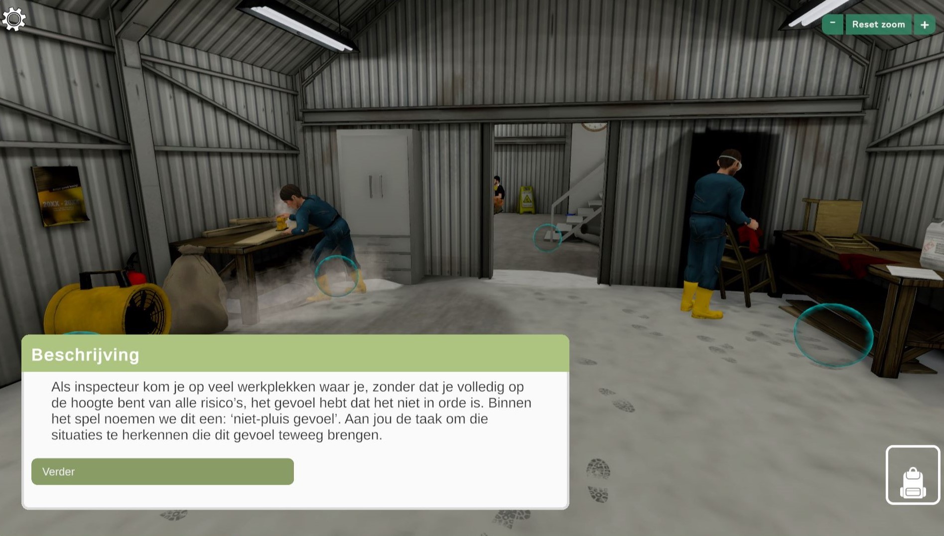 Our most recent foray in the field was designing, creating, and implementing a gameful environment for the workers of Inspectie SZW. The experience was set in a woodworking factory, where inspectors would have to identify and correctly respond to the various health and safety hazards in order to progress.
